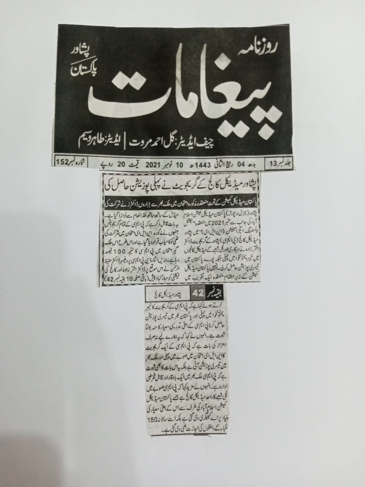 Meanwhile the dean PMC Prof. Dr. Hafeez ur Rahman on the occasion while congratulating Dr. Akhtar Zada and faculty of the college, said that securing first position in KP and third throughout Pakistan by a graduate of PMC is a proof of quality leadership and trend-setting role among the community of medical institutes especially in the private sector of Khyber Pakhtunkhwa.