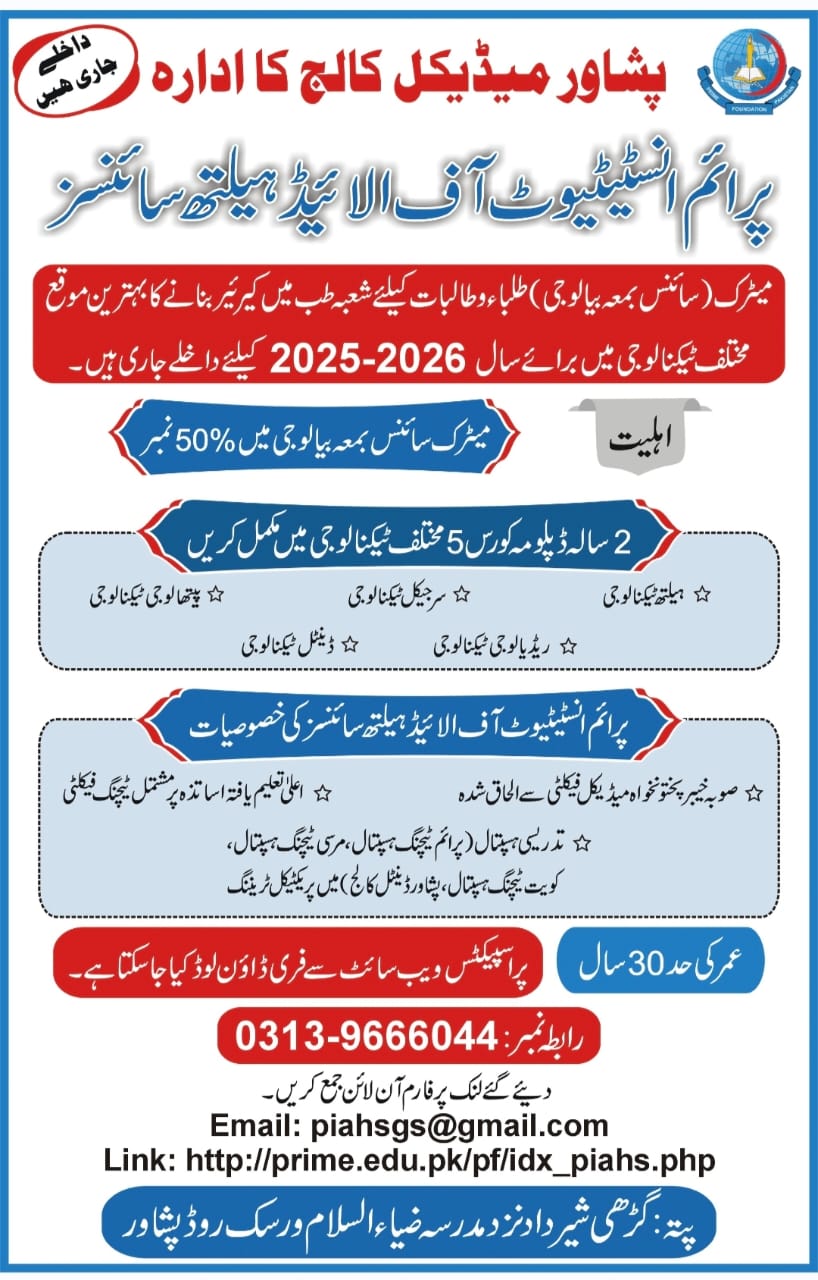 Admission FormWelcome to the Prime Institute of Allied Health Sciences (PIAHS), a premier institution dedicated to preparing future healthcare professionals in Peshawar, Pakistan. Situated at the heart of the city, our institute is committed to providing exceptional education, empowering students to become skilled practitioners and leaders in the field of Allied Health Sciences.